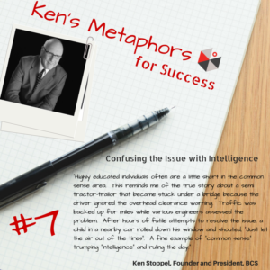 It’s hard to beat the value of common sense… a rarity these days. Here’s Ken’s Metaphor for Success #7: Resist confusing the issue with intelligence.